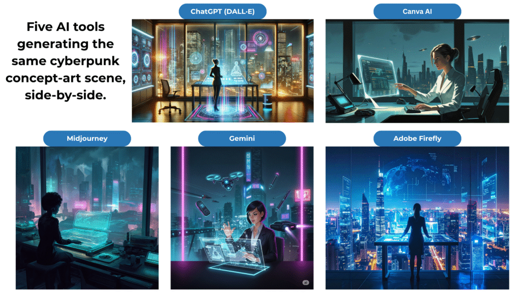 • Same prompt ≠ same vibe — each tool has a distinct look.
