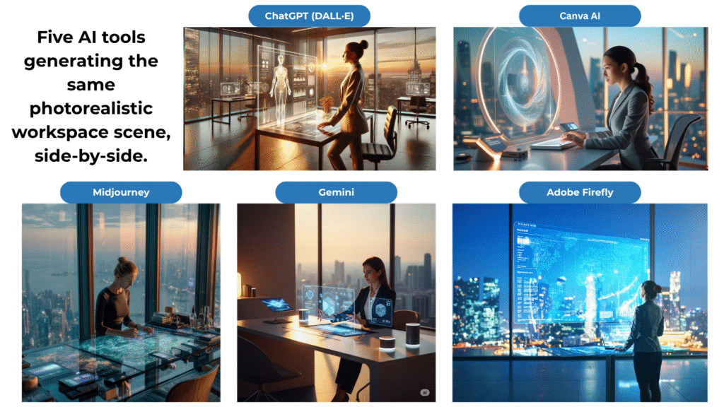 Tools tested: ChatGPT (DALL·E), Google Gemini, Midjourney, Adobe Firefly, Canva AI