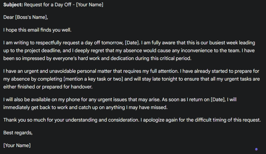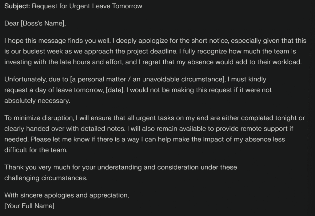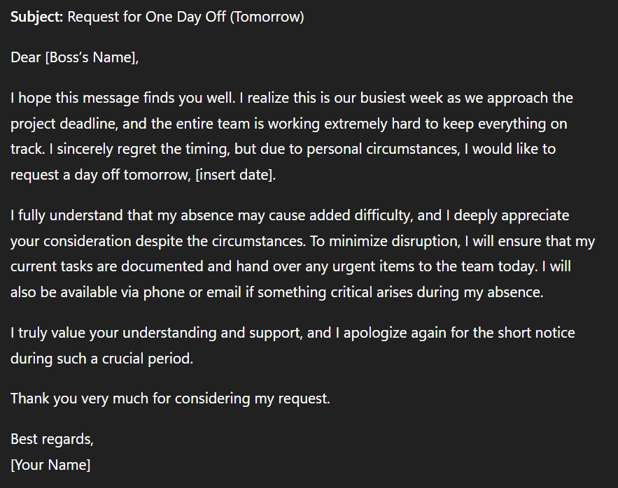 “Write the politest possible email to my boss, asking for a day off tomorrow, even though it’s the busiest week before our project deadline. The team is already working overtime, and I know my absence will cause difficulties, but I really need the day off. Please make it sound professional, respectful, and considerate.”